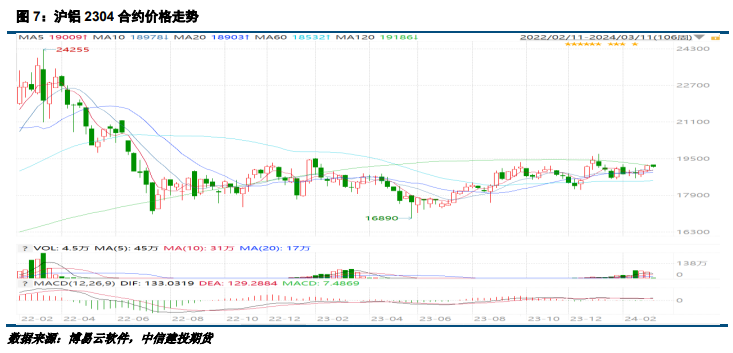 2024年3月7日,据上海有色网数据电解铝锭社会总库存82.1万吨,国内可流通电解铝库存69.5万吨,较本周一累库0.5万吨,较上周四累库3.2万吨,相较节前共累库33.0万吨,进入三月后铝锭累库节奏虽延续但明显放缓,稳居近七年同期低位水平。进入三月传统旺季后,铝锭库存的消耗有望加快,国内铝锭库存整体的增量和增幅将趋缓。