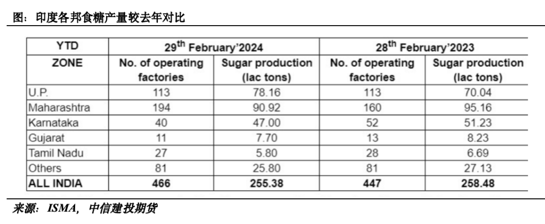 尽管印度产量仍低于去年同期,但是生产进度较快,最终产量或高于榨季初期的预估水平。根据印度糖业和生物能源制造商协会(ISMA)发布的数据,截至2024年2月29日,当前2023/24榨季的食糖产量为2553.8万吨,略低于去年同期的2583.8万吨;产量的减幅正在收窄,目前仍有466家糖厂维持开工状态,高于去年的447家。