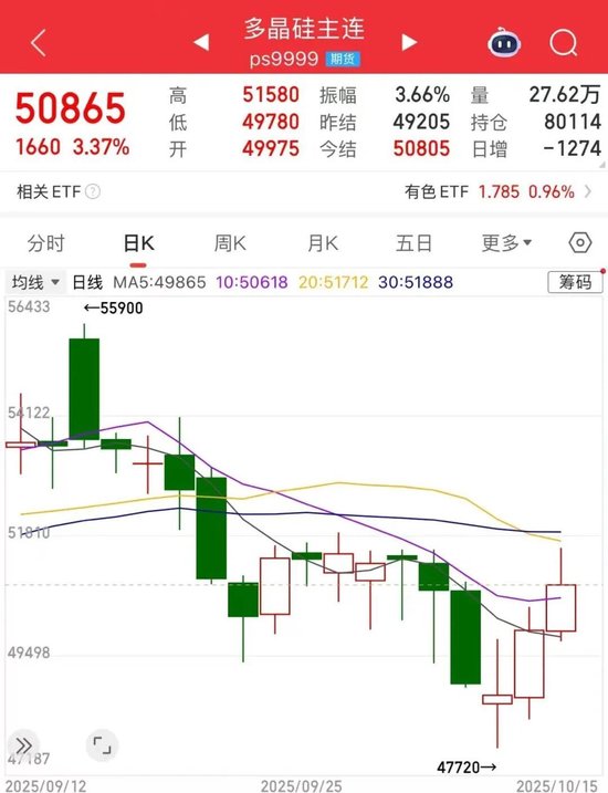 从现货市场来看,李祥英认为,前期多晶硅期货价格快速下跌,2511合约最低跌至47720元/吨,而现货价格却在国庆假期后小幅上涨,盘面贴水现货幅度较大,也给了当前期货价格上涨驱动。数据显示,10月15日,多晶硅现货价格趋稳,N型致密料均价为50000元/吨。