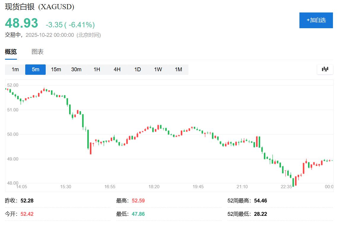 白银也在美股早盘刷新日低,现货白银跌至47.90美元下方,日内跌近8.7%,创2021年2月以来最大盘中跌幅,纽约期银跌至47.12美元,日内跌约8.3%。